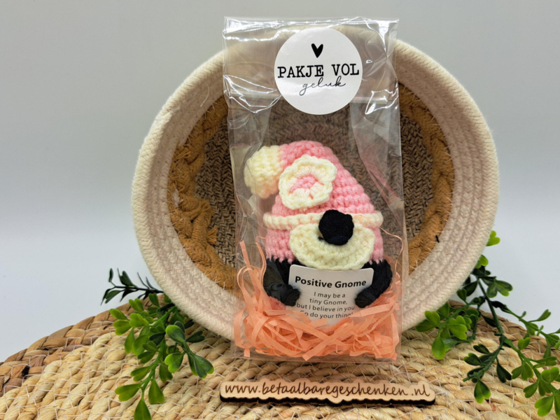 🧶Een schattig gehaakt geluksknuffeltje dat gegarandeerd een glimlach op iemands gezicht tovert! Deze positieve kabouter is niet zomaar een knuffel – het is een echte "Positive Gnome".