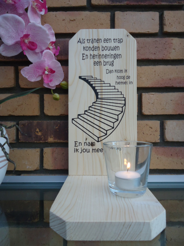 Creëer een liefdevolle herinneringsplek met dit prachtige houten gedenkplekje met bijpassende glazen waxinelichthouder en theelichtje. Het houten paneel is voorzien van een mooie, troostrijke tekst over herinneringen, verlies en verbondenheid, gecombineerd met een sierlijke trapillustratie die symbool staat voor het pad naar de hemel.